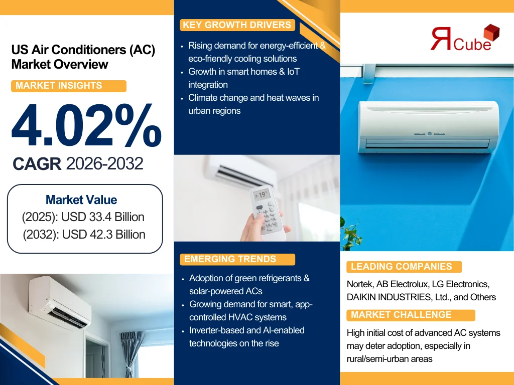 According to The Report Cube’s latest research study US Air Conditioners (AC) Market reached a value of nearly USD 33.4 billion in 2025. The market is assessed to grow at a CAGR of around 4.02%, during the forecast period of 2026-2032 to attain a value of around USD 42.3 billion in 2032.