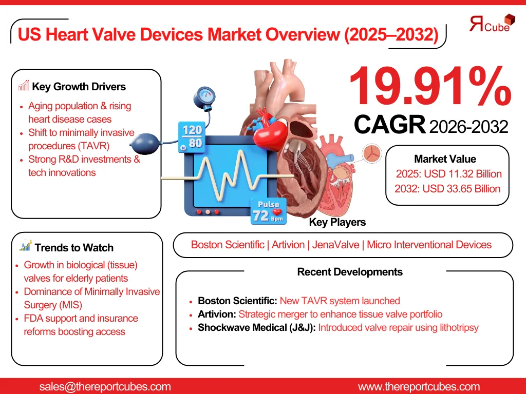 According to The Report Cube’s latest research study US Heart Valve Devices Market reached a value of nearly USD 11.32 billion in 2025. The market is assessed to grow at a CAGR of around 19.91%, during the forecast period of 2026-2032 to attain a value of around USD 33.65 billion in 2032.