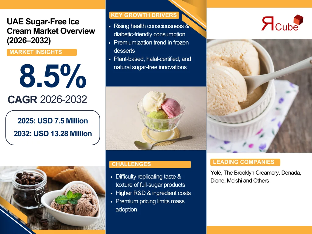 UAE Sugar-Free Ice Cream Market is anticipated to register a CAGR of around 8.5% during 2026–2032. Also, the market size was valued at nearly USD 7.5 million in 2025 and is projected to reach USD 13.28 million by 2032.