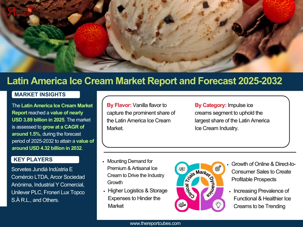 The Report Cube which is one of the leading market research company in UAE expects the Latin America Ice Cream Market to grow at a CAGR of around 1.5% through 2032, as highlighted in their latest research report. The study provides an in-depth analysis of the emerging trends shaping the Latin America Ice Cream Market and offers detailed forecasts for its potential growth during 2025–2032. The report also presents a comprehensive assessment of the competitive landscape, including profiles of leading players, their performance metrics, and recent strategic developments. Additionally, it explores the key market drivers, challenges, opportunities, and provides insights into historical and future revenue trends at the global, regional, and country levels.
