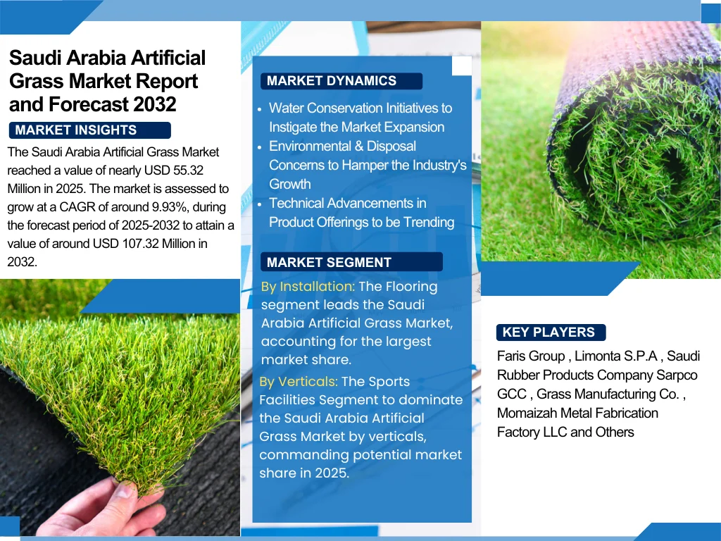 The Report Cube which is one of the leading market research company in UAE expects the Saudi Arabia Artificial Grass Market to grow at a CAGR of around 9.93% through 2032, as highlighted in their latest research report. The study provides an in-depth analysis of the emerging trends shaping the Saudi Arabia Artificial Grass Market and offers detailed forecasts for its potential growth during 2025–2032. The report also presents a comprehensive assessment of the competitive landscape, including profiles of leading players, their performance metrics, and recent strategic developments. Additionally, it explores the key market drivers, challenges, opportunities, and provides insights into historical and future revenue trends at the global, regional, and country levels.