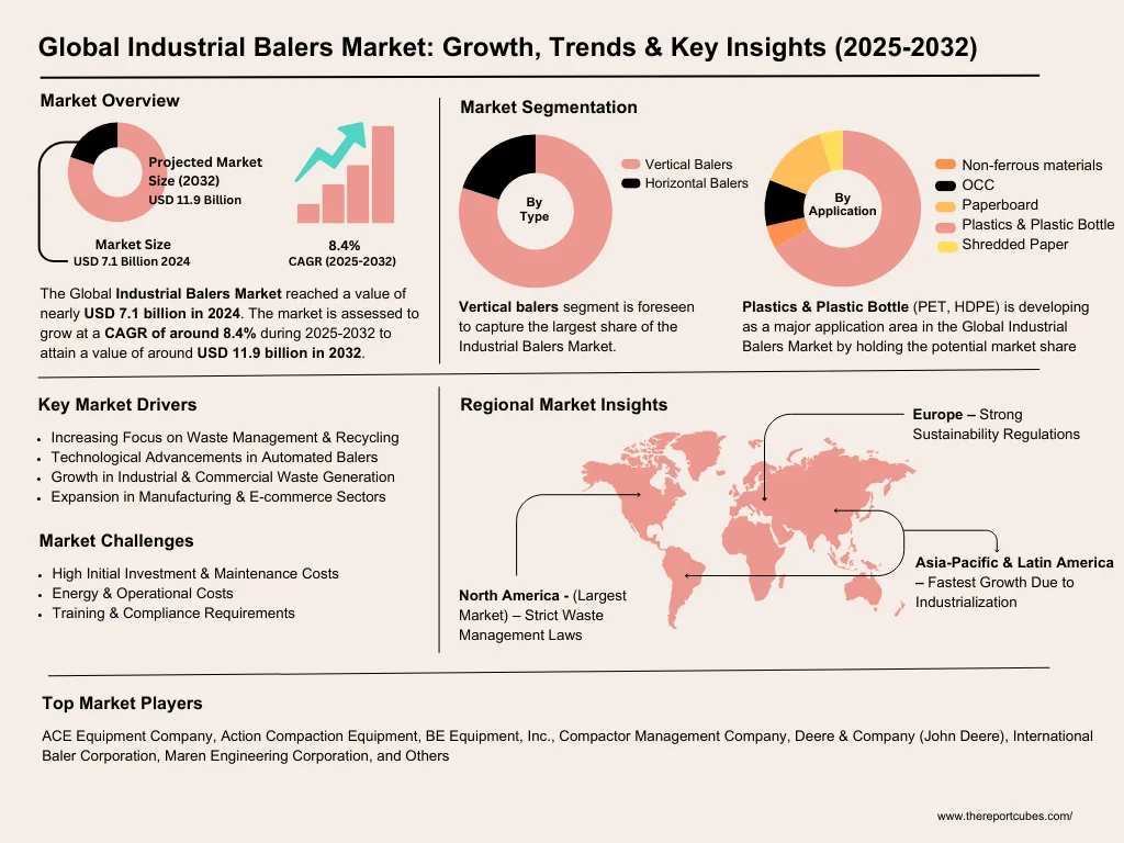 The Report Cube which is one of the leading market research company in UAE expects the Industrial Balers Market to grow at a CAGR of around 9.2% through 2032, as highlighted in their latest research report. The study provides an in-depth analysis of the emerging trends shaping the Industrial Balers Market and offers detailed forecasts for its potential growth during 2025–2032. The report also presents a comprehensive assessment of the competitive landscape, including profiles of leading players, their performance metrics, and recent strategic developments. Additionally, it explores the key market drivers, challenges, opportunities, and provides insights into historical and future revenue trends at the global, regional, and country levels.