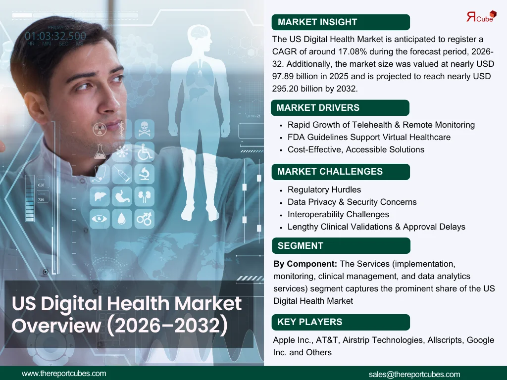 The Report Cube which is one of the leading market research company in UAE expects the US Digital Health Market to grow at a CAGR of around 17.08% through 2032, as highlighted in their latest research report. The study provides an in-depth analysis of the emerging trends shaping the US Digital Health Market and offers detailed forecasts for its potential growth during 2026–2032. The report also presents a comprehensive assessment of the competitive landscape, including profiles of leading players, their performance metrics, and recent strategic developments. Additionally, it explores the key market drivers, challenges, opportunities, and provides insights into historical and future revenue trends at the global, regional, and country levels.