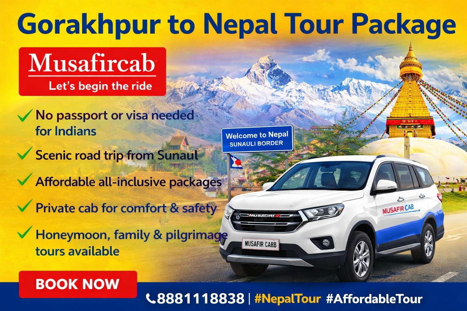 A Nepal tour from Gorakhpur is more than just a holiday—it's a journey filled with culture, spirituality, nature, and unforgettable memories. With Musafircab's affordable pricing, reliable services, and personalized approach, your Nepal trip becomes smooth, safe, and truly enjoyable.