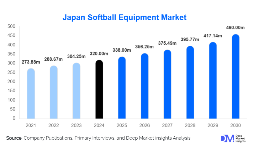 According to Deep Market Insights, the global Japan Softball Equipment Market size is projected to grow from USD 338 million in 2025 to reach USD 460 million by 2030, expanding at a CAGR of 5.4% during the forecast period (2025–2030).