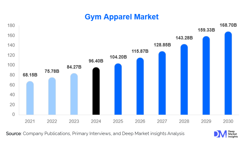 According to Deep Market Insights, the global Gym Apparel Market size is projected to grow from USD 104.2 Billion in 2025 to reach USD 168.7 Billion by 2030, expanding at a CAGR of 11.2% during the forecast period (2025–2030).
