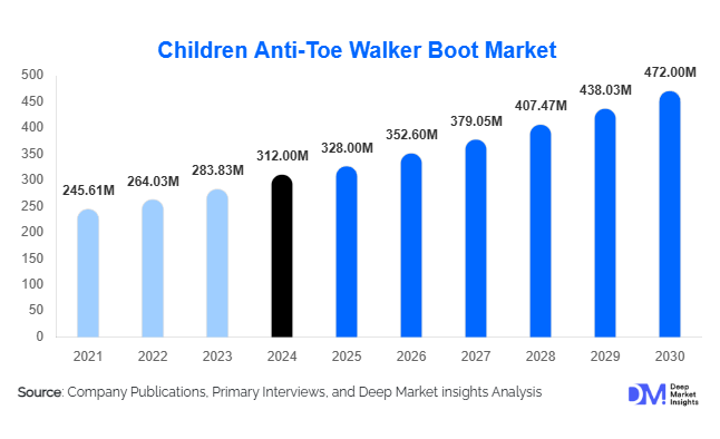 According to Deep Market Insights, the global Children Anti-Toe Walker Boot Market size is projected to grow from USD 328 Million in 2025 to reach USD 472 Million by 2030, expanding at a CAGR of 7.5% during the forecast period (2025–2030).