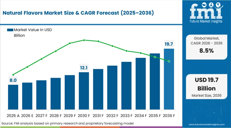 The global natural flavors market is entering a decade of structural transformation, driven by shifting consumer trust, regulatory scrutiny, and supply chain volatility. According to analysis by Future Market Insights (FMI), the market was valued at USD 8.0 billion in 2025 and is projected to reach USD 8.7 billion in 2026. By 2036, revenues are expected to climb to USD 19.7 billion, reflecting a robust CAGR of 8.5%.