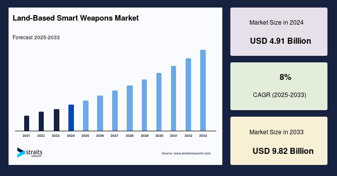 According to StraitsResearch, the global land based smart weapons market size was valued at USD 4.91 billion in 2024 and is estimated to reach USD 9.82 billion by 2033, growing at a CAGR of 8% during 2025-2033.