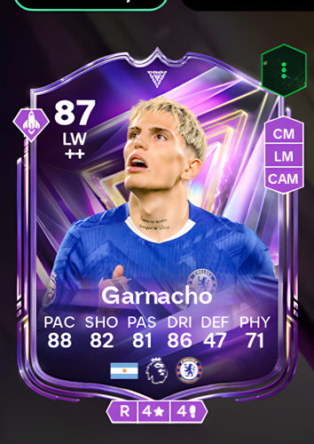 Introducing the dynamic Alejandro Garnacho FC Pro card, an 87-rated Left Wing who excels as a sharp attacking player. With a blistering 88 pace and 86 dribbling, he is perfectly equipped to quickly tear apart the opposing team's defense. Supported by solid shooting (82) and passing (81) attributes, Garnacho can seize opportunities to score crucial goals and seal the deal in any game, making him a formidable asset on the virtual pitch.