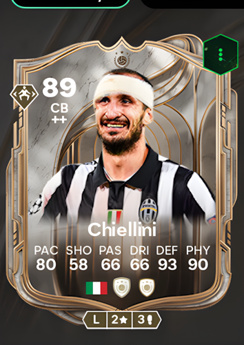 Thẻ Icon của Giorgio Chiellini nổi bật như một Trung vệ mạnh mẽ với xếp hạng tổng thể ấn tượng là 89, có các thuộc tính phòng ngự (93) và thể chất (90) đáng chú ý. Trong khi tốc độ (80) của anh đảm bảo anh có thể theo kịp các tiền đạo nhanh nhẹn, khả năng chuyền bóng (66) và rê bóng (66) của anh mang lại sự tin cậy khi xây dựng lối chơi từ phía sau. Mặc dù không nổi tiếng về khả năng sút bóng (58), điểm mạnh của Chiellini nằm ở khả năng neo giữ hàng phòng ngự, chặn đứng các pha tấn công nguy hiểm và thống trị các pha không chiến. Thẻ này lý tưởng cho những người chơi tìm kiếm một hậu vệ kiên cường và thông minh chiến thuật có thể củng cố hàng phòng ngự của họ và vô hiệu hóa ngay cả những đối thủ đáng gờm nhất.