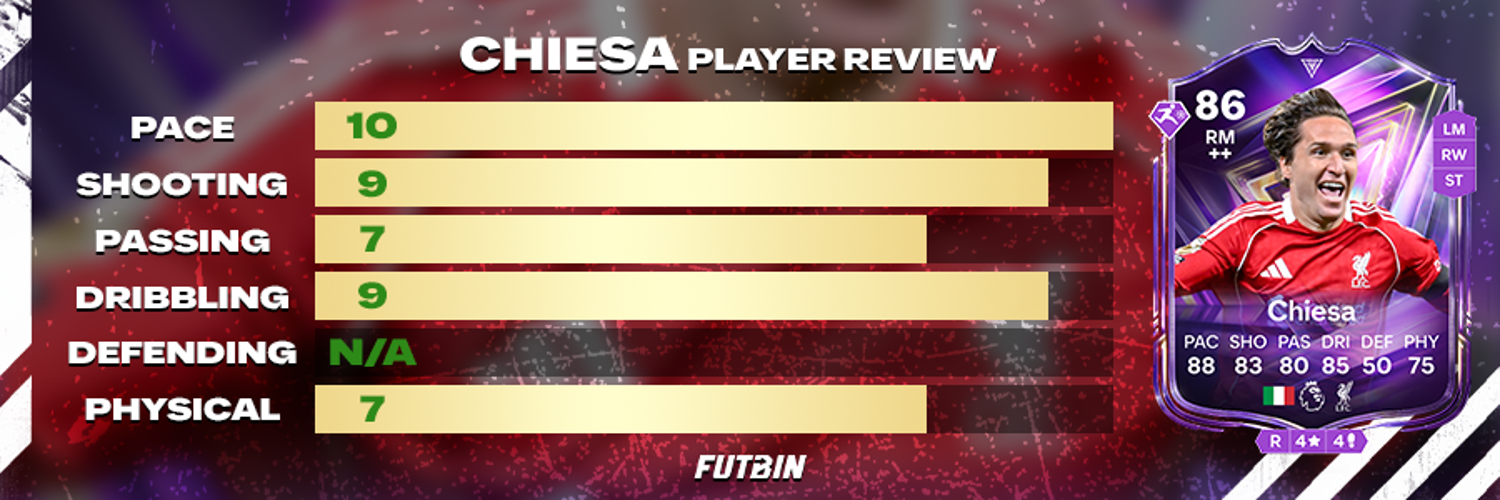 - Mặc dù tôi thường thấy rằng một số cầu thủ thể hiện tốt hơn so với chỉ số của họ (Claudia Pina là một ví dụ điển hình), điều ngược lại cũng có thể đúng. Chỉ số Sức mạnh 71 của Chiesa là một trường hợp như vậy—nó cảm thấy thấp hơn đáng kể trong trò chơi. Anh ấy dễ dàng bị các hậu vệ đẩy ra khỏi bóng, khiến con số đó cảm thấy quá hào phóng.
