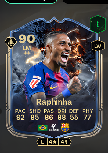 Thẻ Thunderstruck của Raphael Dias Belloli nổi bật như một Tiền vệ Trái năng động với xếp hạng tổng thể ấn tượng là 90, khiến anh trở thành một sự hiện diện đáng gờm trên sân cỏ. Với tốc độ đáng kinh ngạc ở mức 92, kỹ năng rê bóng sắc bén được đánh giá ở mức 88, và khả năng sút và chuyền bóng mạnh mẽ với xếp hạng lần lượt là 85 và 86, thẻ này nắm bắt được bản chất của một cầu thủ chạy cánh tấn công hàng đầu. Với những thuộc tính này, Belloli được trang bị hoàn hảo để xuyên thủng hàng phòng ngự đối phương, tạo ra cơ hội ghi bàn và thực hiện những pha chơi quyết định có thể xoay chuyển cục diện của bất kỳ trận đấu nào theo hướng có lợi cho bạn.