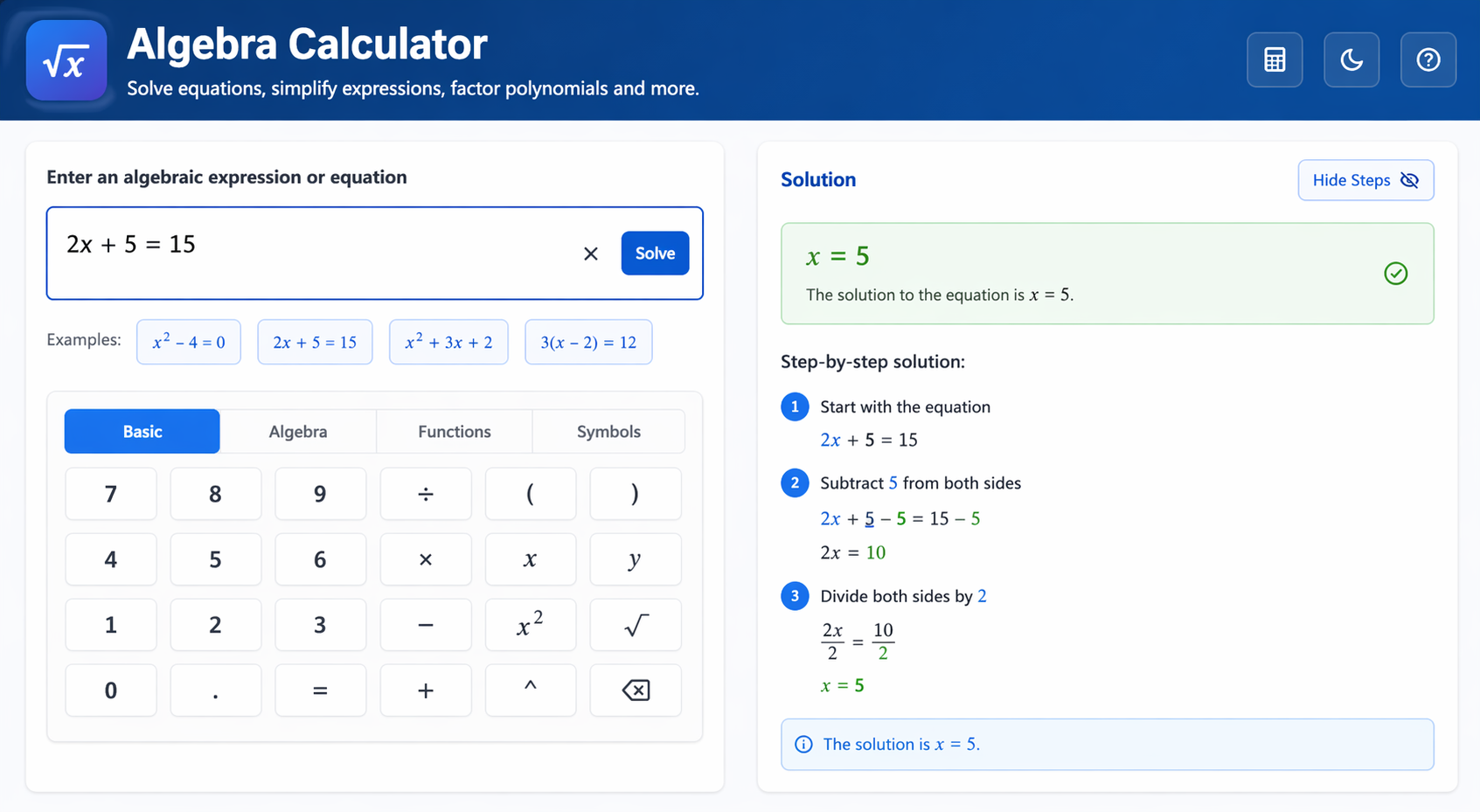 An Algebra Calculator is a digital tool designed to solve algebra problems quickly and accurately. It can handle different types of mathematical equations such as linear equations, quadratic equations, and even complex expressions. Instead of solving problems manually, you can simply enter the equation into the calculator and get the answer instantly.