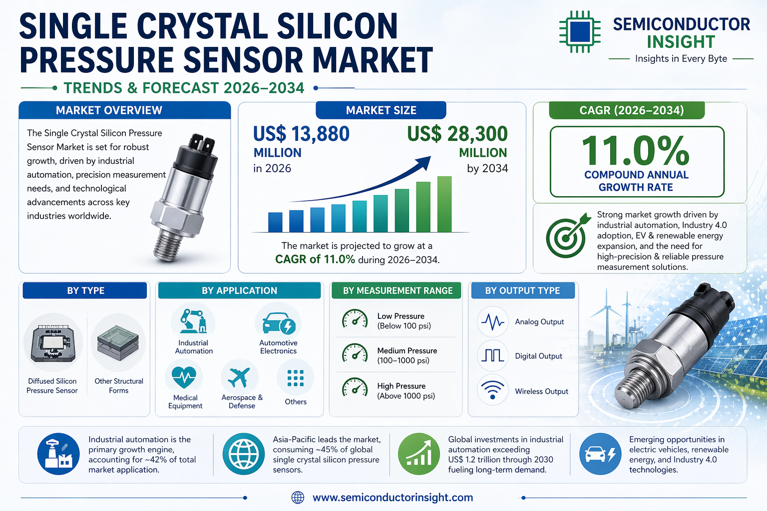 Global Single Crystal Silicon Pressure Sensor Market, valued at a robust US$ 13,880 million in 2024, is on a trajectory of significant expansion, projected to reach US$ 28,300 million by 2032. This growth, representing a compound annual growth rate (CAGR) of 11.0%, is detailed in a comprehensive new report published by Semiconductor Insight. The study highlights the critical role of these precision measurement devices in ensuring accuracy and reliability across high-stakes industries, particularly industrial automation and semiconductor manufacturing.