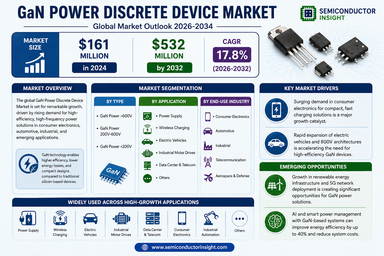 Global GaN Power Discrete Device Market, valued at $161 million in 2024, is poised for remarkable expansion, projected to reach $532 million by 2032. This robust growth, driven by a 17.8% CAGR, is detailed in a comprehensive new report published by Semiconductor Insight. The study underscores the transformative role of gallium nitride technology in revolutionizing power efficiency across multiple high-growth sectors, particularly consumer electronics, automotive, and industrial applications.